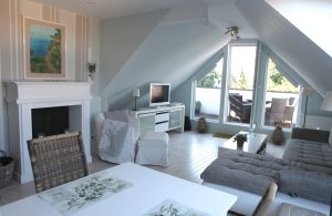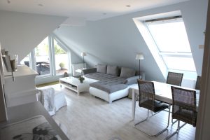Die Ferienwohnung verfügt über ein Schlafzimmer und ein Bad mit Dusche und Badewanne. Separater WC. Eine komplett eingerichtete Küche und ein Wohnzimmer mit Dachterrasse (2.Obergeschoß).